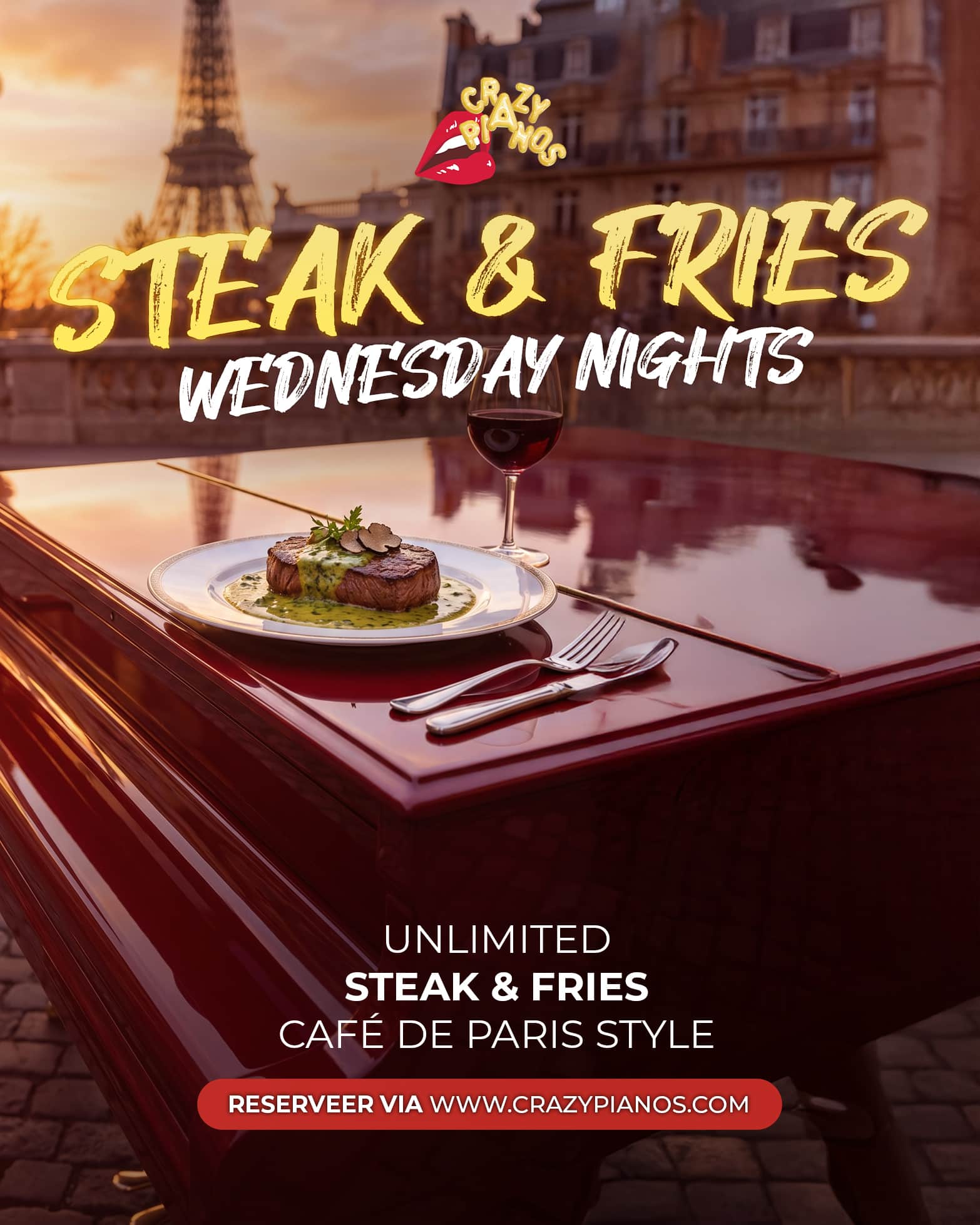 Elke woensdag in april t/m juni staat in het teken van onbeperkte Steak de Paris en live muziek bij Crazy Pianos! Kom langs en geniet van onbeperkt twee uur lang van onze heerlijke Steak & Fries terwijl je meezingt met onze Crazy entertainers die jullie verzoekjes speelt!
